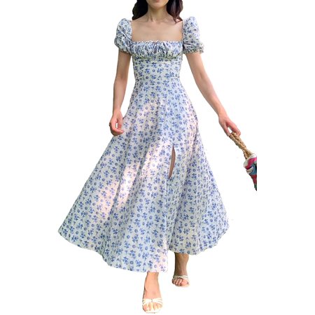 Women S Puff Sleeve Floral Maxi Dress Square Neck Cottagecore Boho Backless Beach Party Cute Long Summer Dresses Walmart Canada